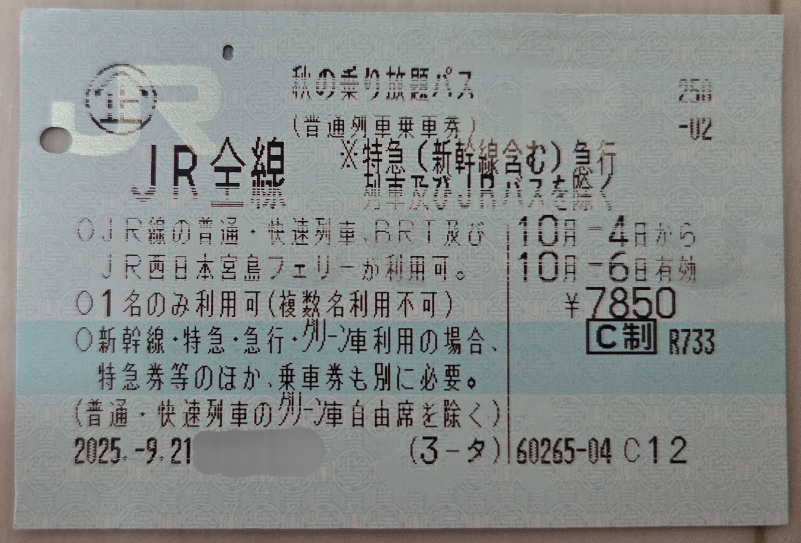 秋の乗り放題パスは、普通・快速列車などを連続する3日間自由に乗り降りできるきっぷです。